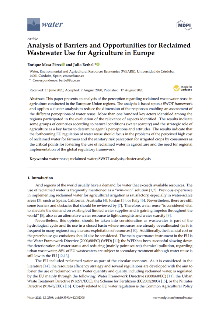 2020. SWOT Analysis of Reclaimed Water Use for Irrigation in Southern Spain